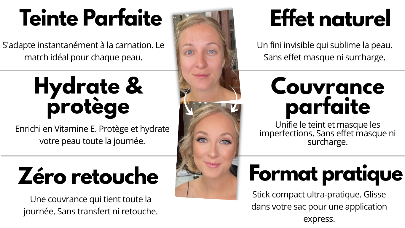 Notre fond de teint stick 2-en-1 combine maquillage et soin en un seul geste. Formulé avec des ingrédients nourrissants, il hydrate intensément votre peau tout en unifiant parfaitement votre teint. Enrichi en Vitamine E et minéraux protecteurs, il offre une couvrance naturelle qui laisse votre peau douce, lumineuse et protégée toute la journée. Sa formule unique s'adapte instantanément à votre carnation et convient à tous les types de peau.